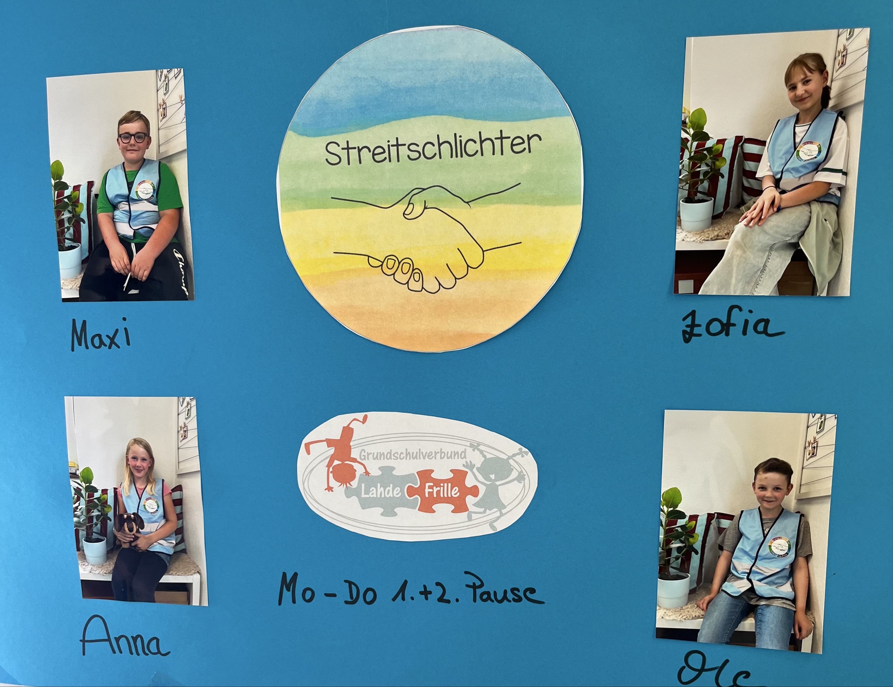 Von Montag bis Donnerstag sind sie in der 1. und 2. Pause auf dem Schulhof aktiv. Blaue Westen machen Sie erkenntlich. Im Forum findet Ihr ein Plakat, wo sich alle Streitschlichter*innen vorstellen. Auch in Frille hängt ein solches Plakat an der Tür des Lesecafe´s.